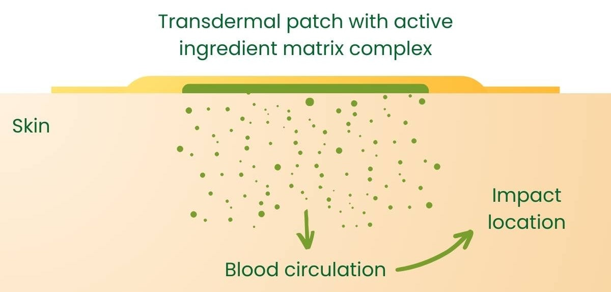 Il rilascio degli ingredienti dal cerotto è continuo e controllato e corrisponde ad un ritardo. In questo modo si eliminano gli alti e bassi che si verificano durante l'assunzione di compresse, capsule, polvere da bere, shot e bevande. Ciò si traduce in un profilo di concentrazione piatto e stabile e si possono evitare effetti indesiderati dovuti ai picchi di concentrazione.